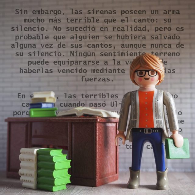 Playmobil conmemorativo del centenario de las librerías Thalia (1919), complementado con un fragmento del cuento «El silencio de las sirenas» de Franz Kafka.